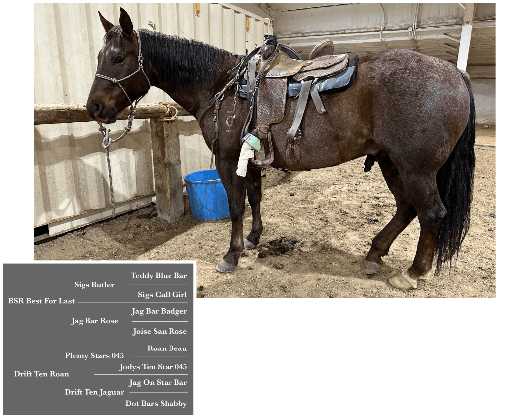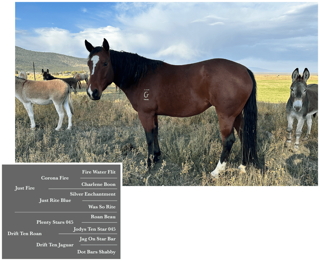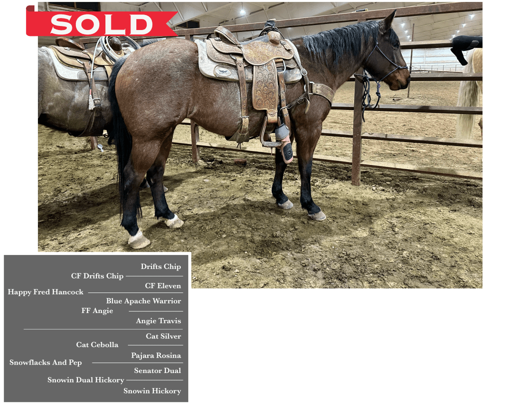 Maiz has impressed us from the beginning in our program. She has dragged calves to the fire, roped outside, and ridden in the mountains. She made the short go on the head side during her first trip to Arizona, and has been to the pay window multiple times on the heel side. Maiz is cowy and has natural athleticism, and shown she is always aiming to please. She will be successful wherever she goes. She’s a granddaughter to the great Pat Cowan and her dam goes back to Plenty Happy and Figure Four Three.