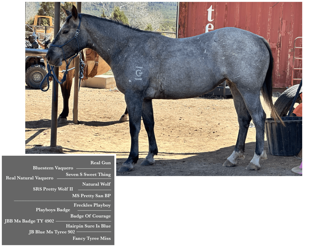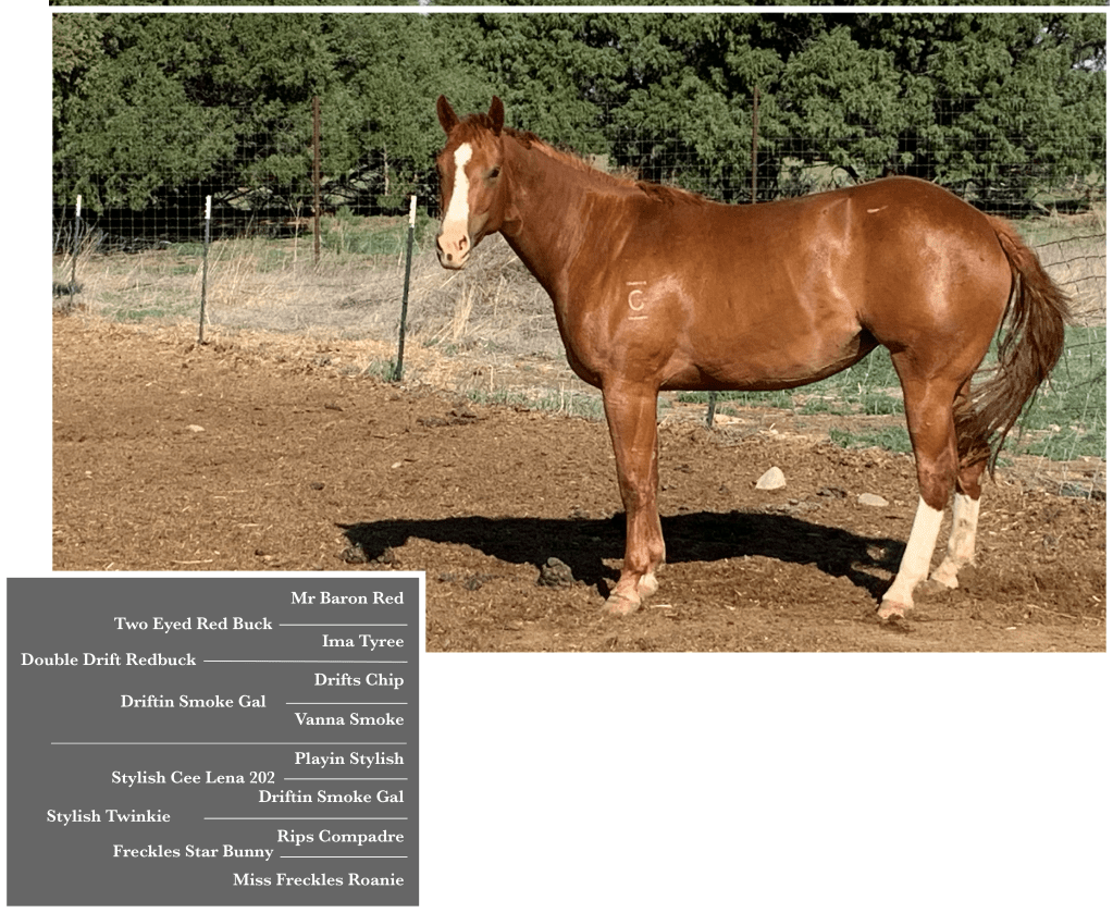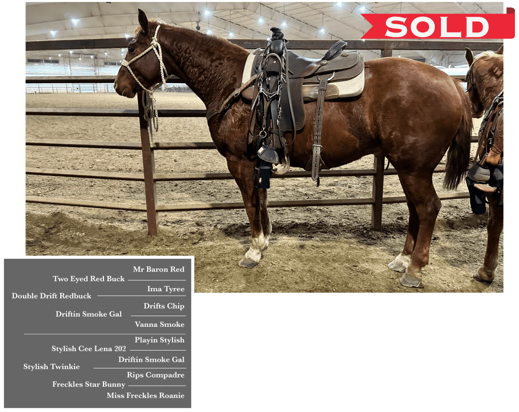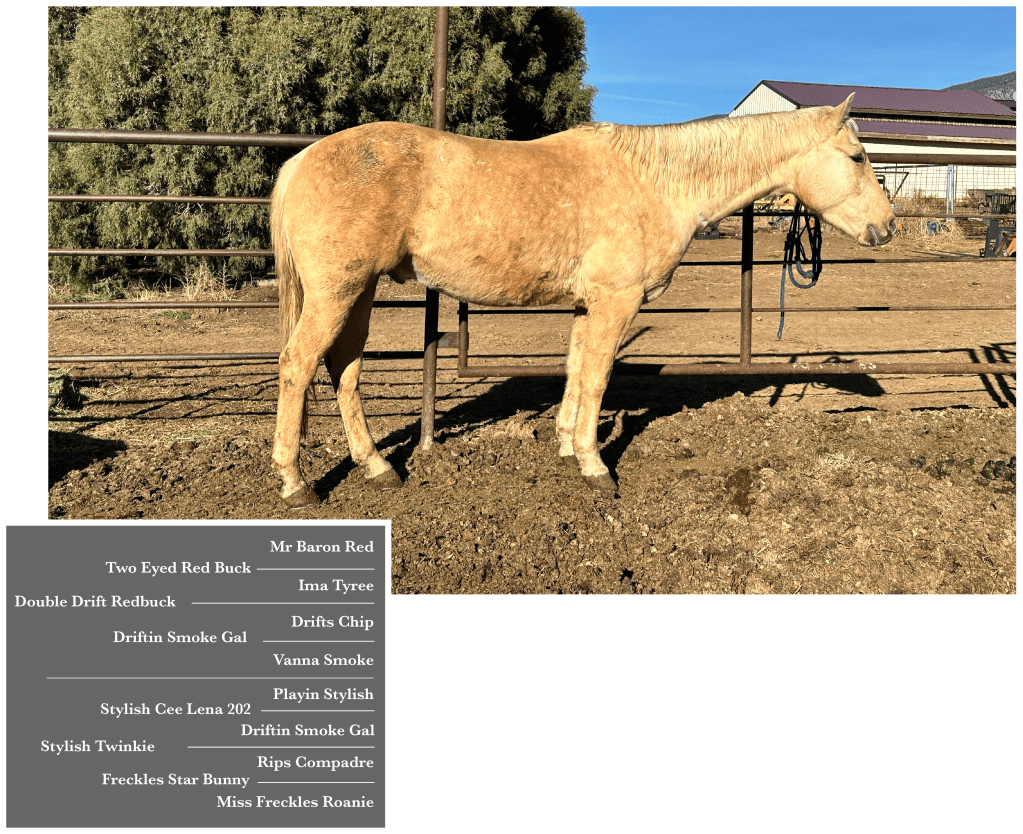 Palominos don’t come this color every day. She’s a home raised gem, a 3/4 sister to the horse that Clay took to the pay window in 2021 for over $60,000 total. She has been ridden outside in the pasture and the mountains, and been to brandings dragging calves. There’s not much this mare hasn’t seen, and she’s never said no. Yuma has been to Arizona and Vegas, made the short go in the Finale on the heel side in the 11, and is easy to be around. Her papers are nothing to forget about, with Two Eyed Red Buck, Drifts Chip, Playin Stylish all there.